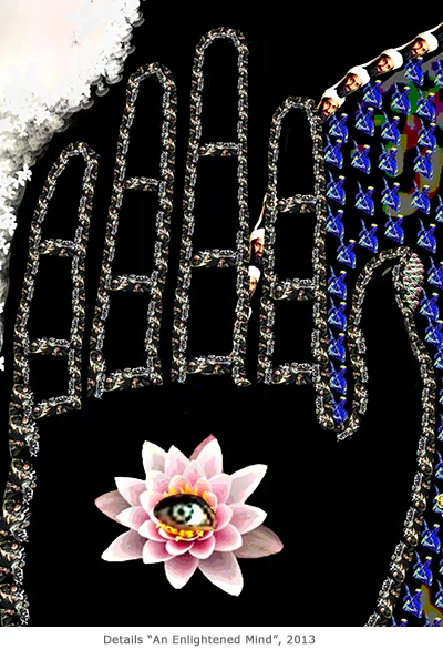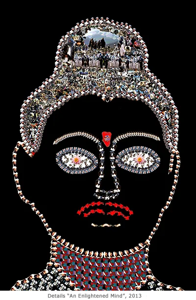 In response to the destruction of two 6th century Buddha statues by a fanatical Taliban group, Michael responds in a constructive manner, 'rebuilding' one of the statues using Taliban imagery, unifing the two cultures in one image.