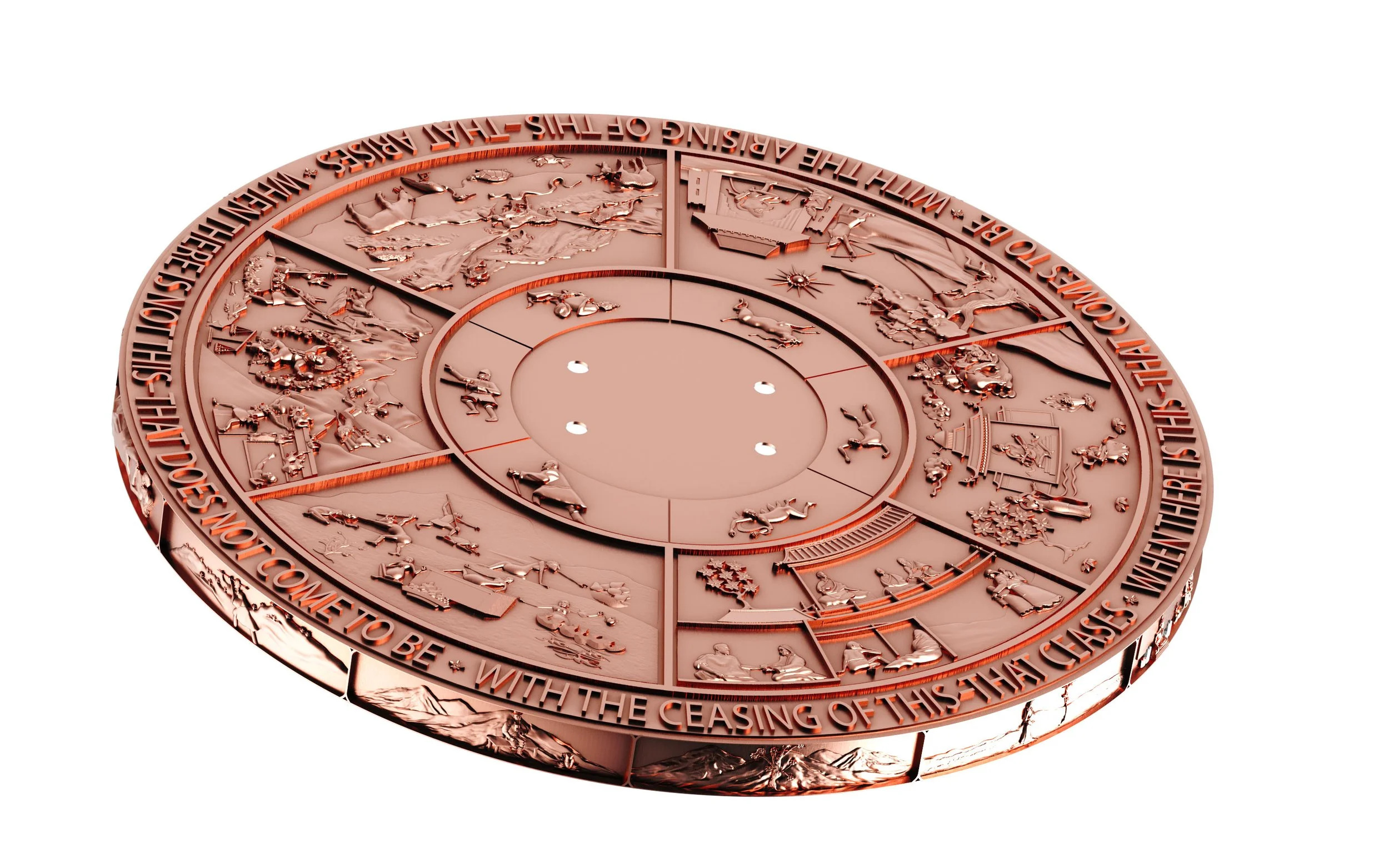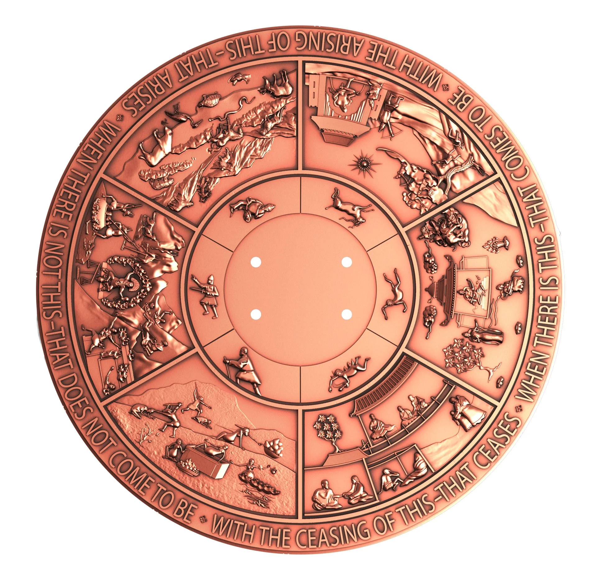 This sculptural project reinterprets the traditional Tibetan Wheel of Life (Bhavachakra) through contemporary fabrication techniques. Using computer-aided design (CAD), the intricate elements of the diagram are digitally sculpted and 3D-printed. These components are then electroplated with copper and nickel, creating a striking metallic surface that bridges ancient symbolism with modern materiality. The Wheel of Life is a visual representation of dependent arising (pratītyasamutpāda), illustrating the interconnected cycles of existence, suffering, and liberation. This sculpture transforms the traditional two-dimensional mandala into a dynamic, multi-layered structure, where each realm and symbolic element is spatially arranged to enhance viewer engagement. The use of electroplated metals not only reinforces the themes of impermanence and transformation but also evokes the ritual and sacred art traditions of Tibetan Buddhism. By merging advanced digital fabrication with philosophical depth, this piece serves as both a meditative object and an exploration of contemporary sculptural techniques in expressing timeless wisdom.