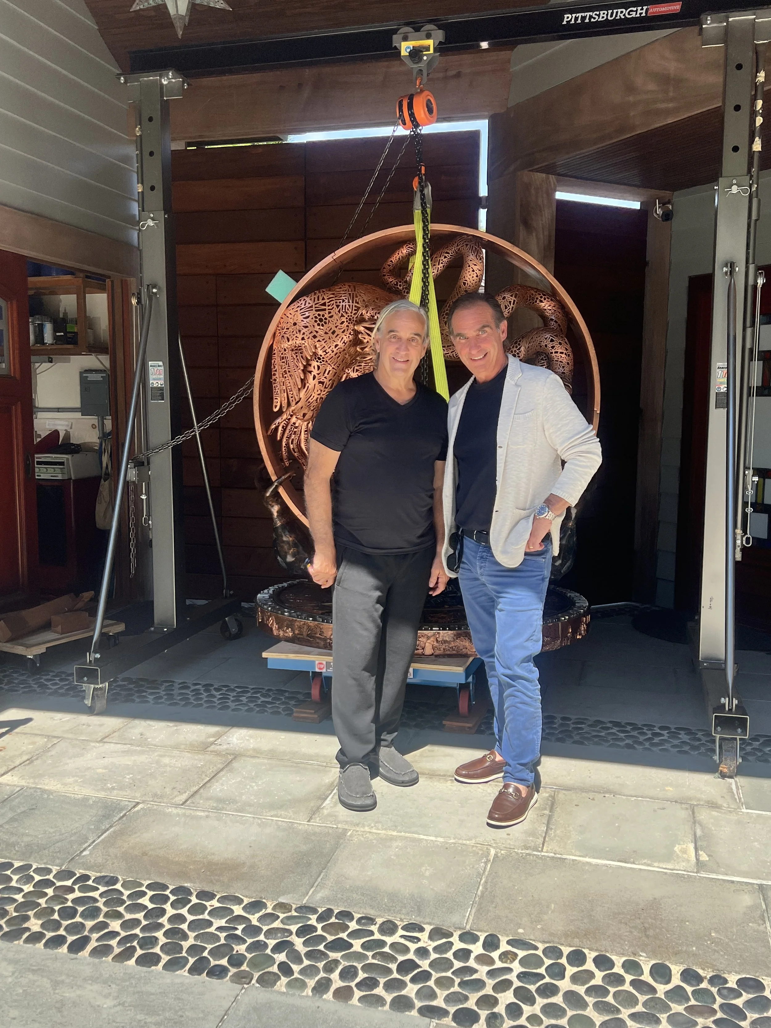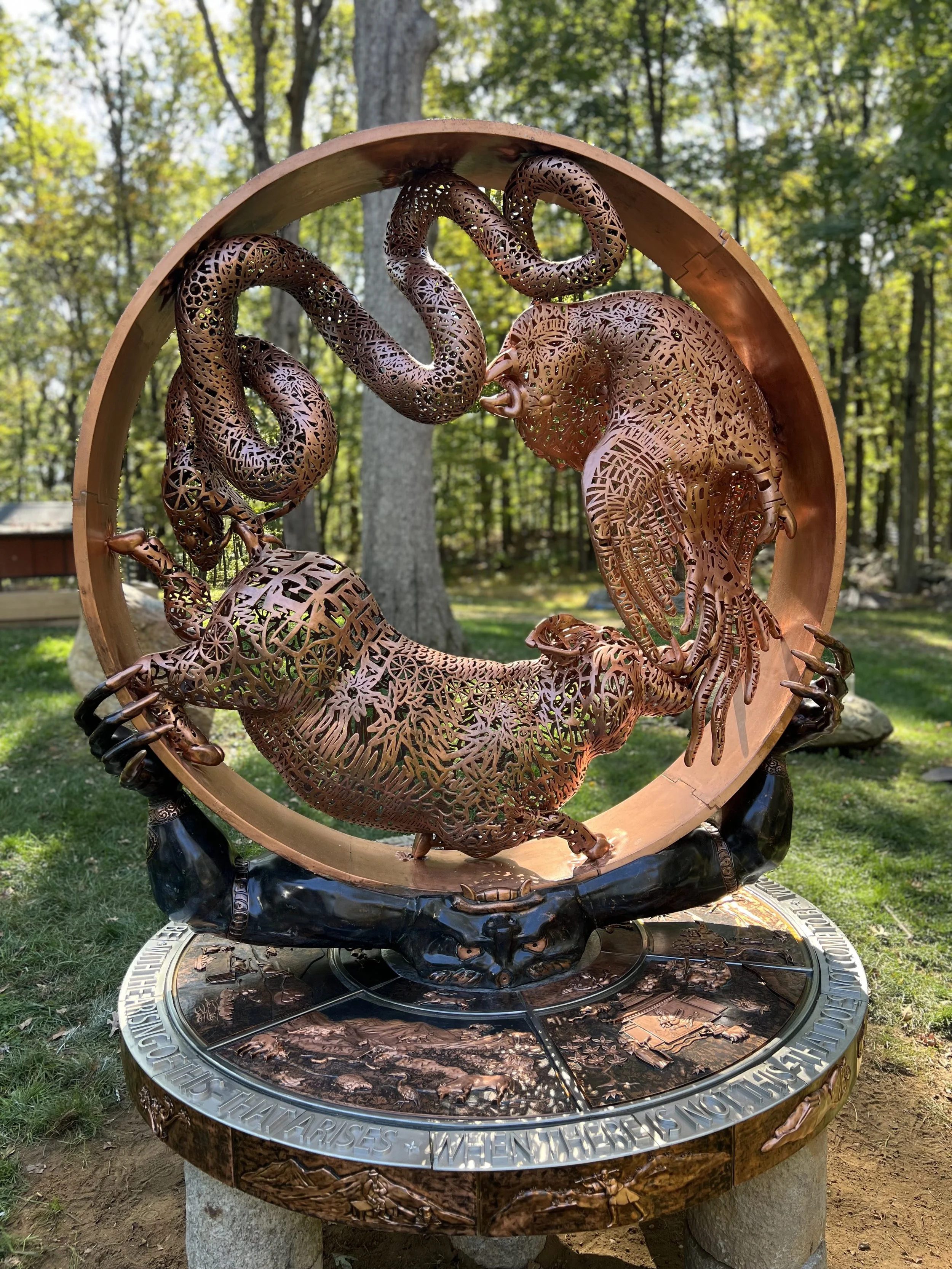 As this work has evolved into its most recently commissioned, large-scale installation in Connecticut, The Root Cause transcends its origins as a reinterpretation of the traditional Tibetan Wheel of Life to become an immersive, spatial experience that engages the viewer on physical as well as philosophical levels. The expanded format amplifies the cycle of interdependent existence — from volition and attachment to suffering and liberation — inviting a contemplative encounter with the mechanisms of the mind made manifest. Through this larger installation, the sculpture becomes both a center of reflection and a dynamic environment, where scale and materiality enhance the spiritual and psychological presence of the work.